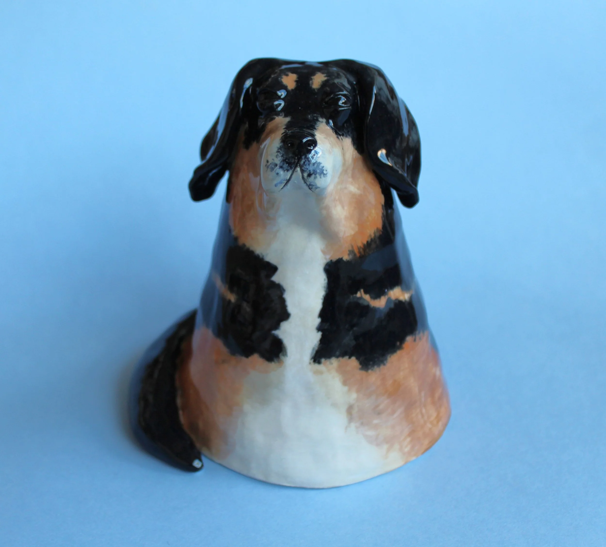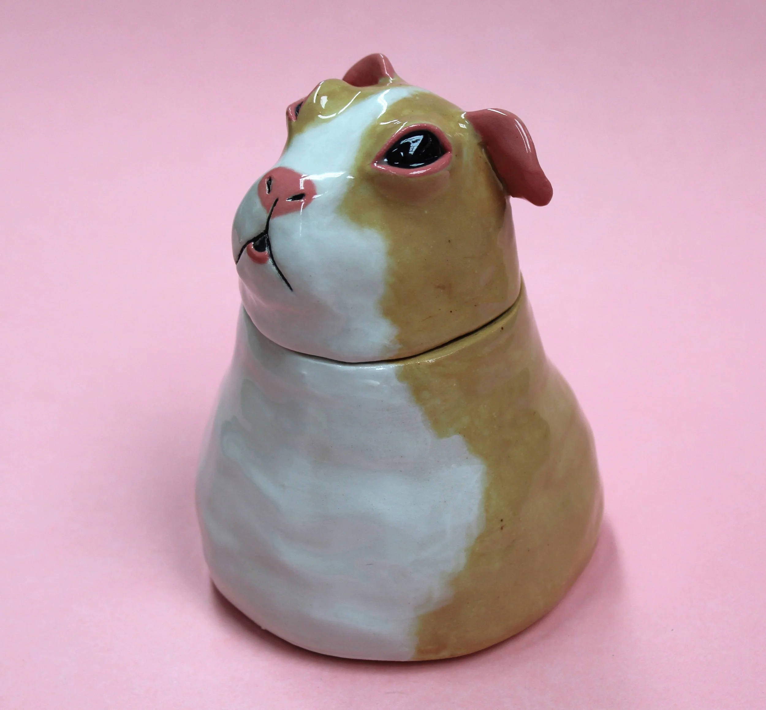 A custom ceramic urn, handmade and handpainted to look like your pet. These urns are customizable and can feature many attributes that bring out your pets personality. Some people request tongues, teeth, platforms, favourite toys and other items that remind them of their beloved pet.