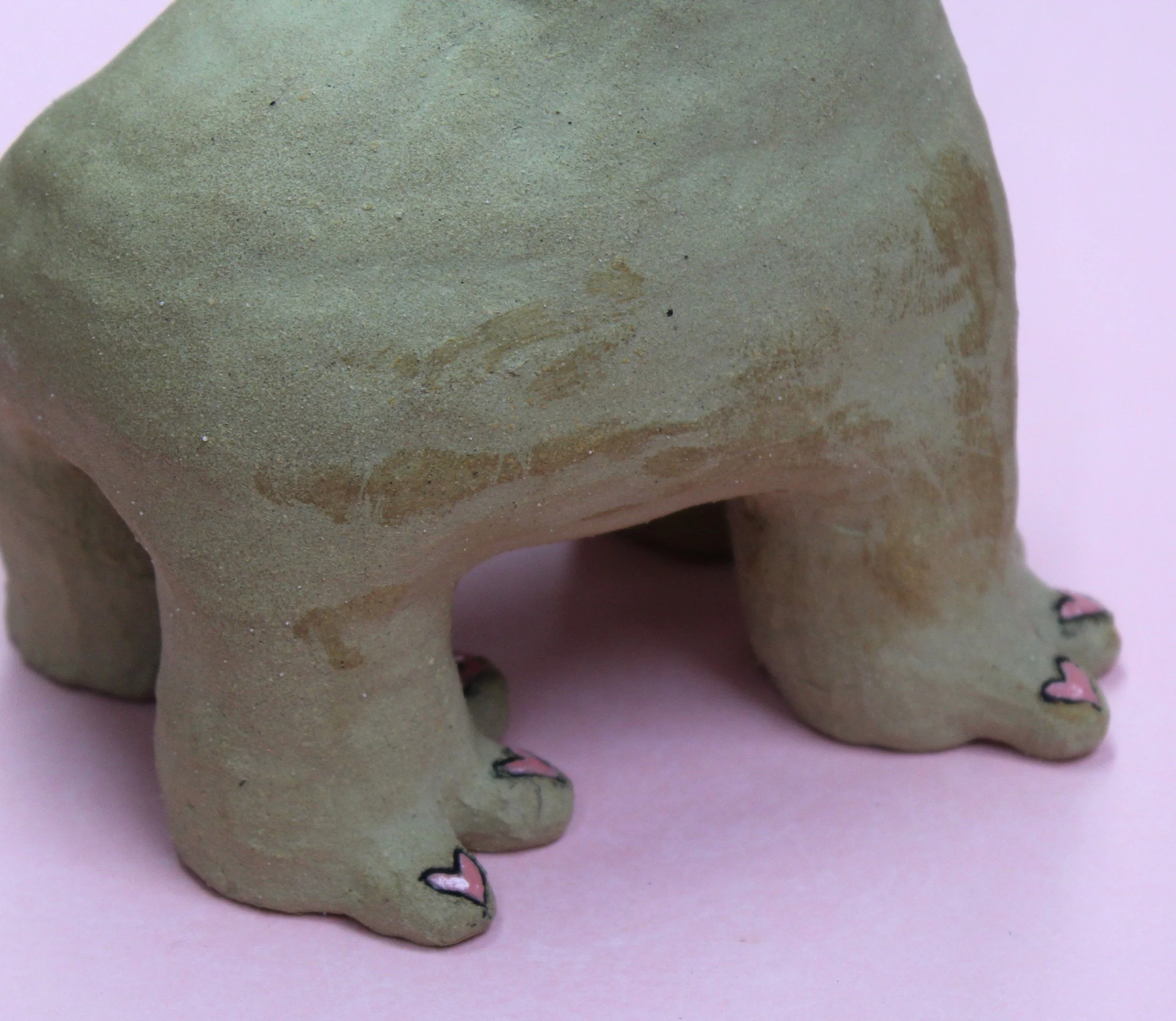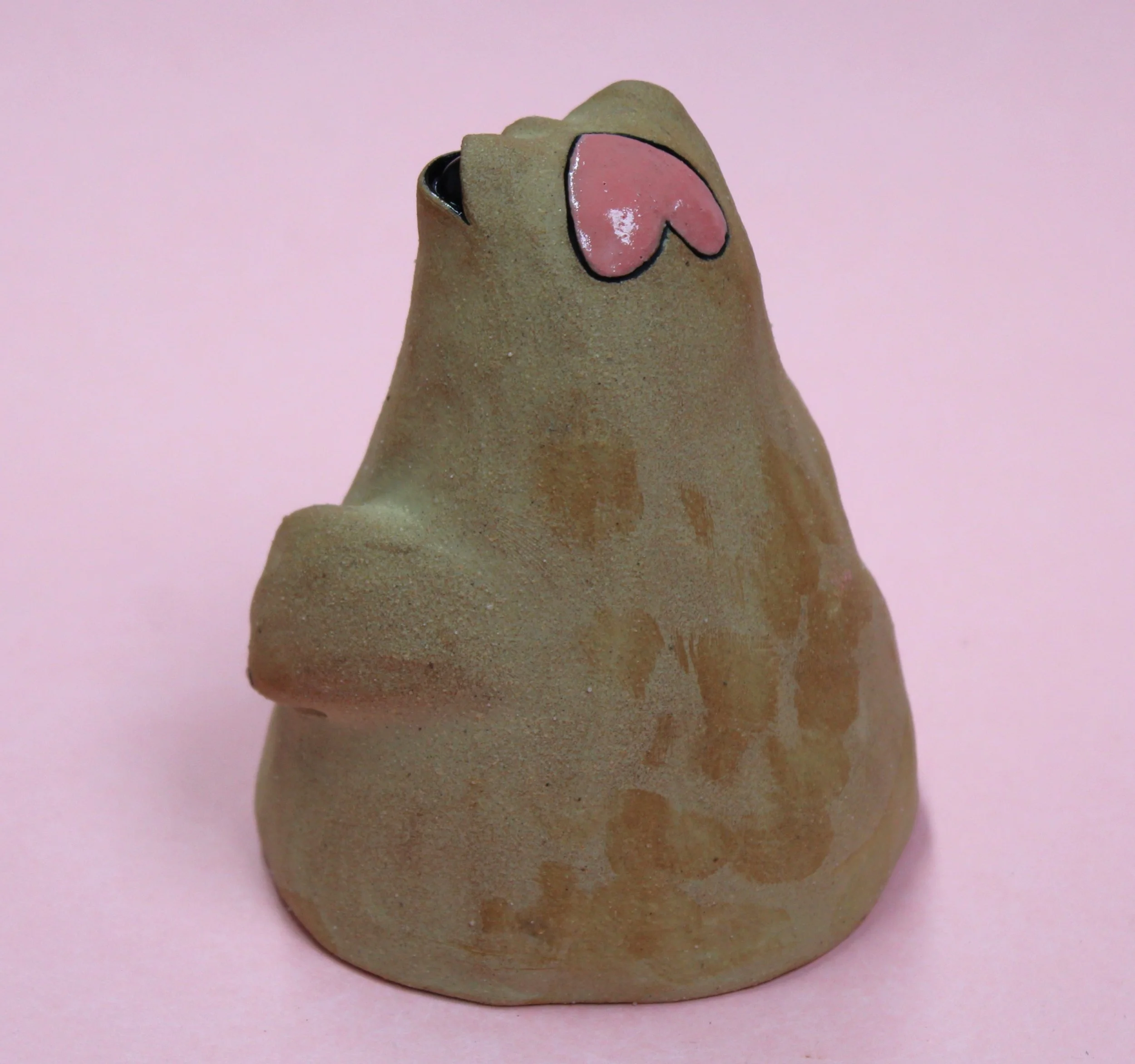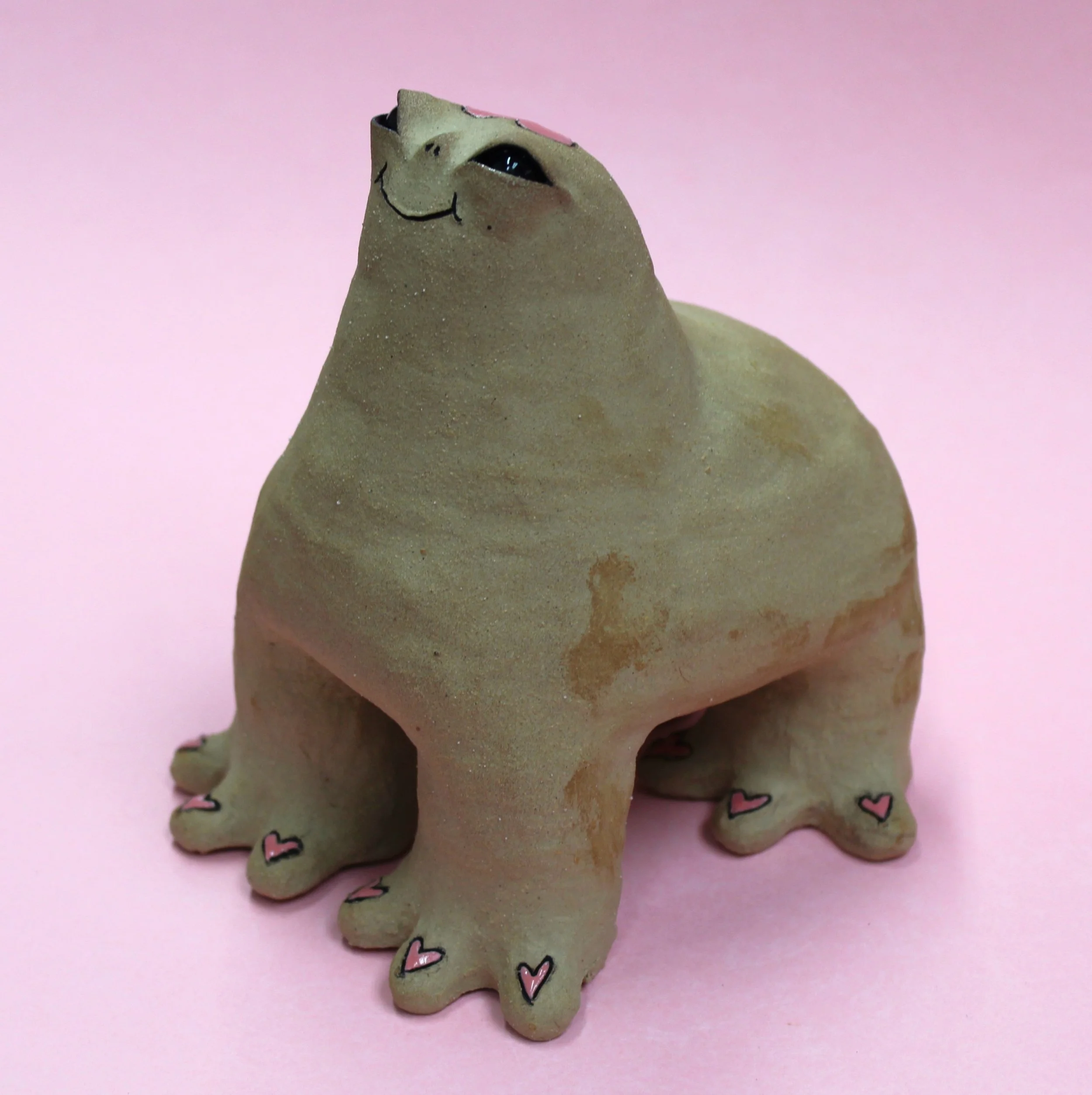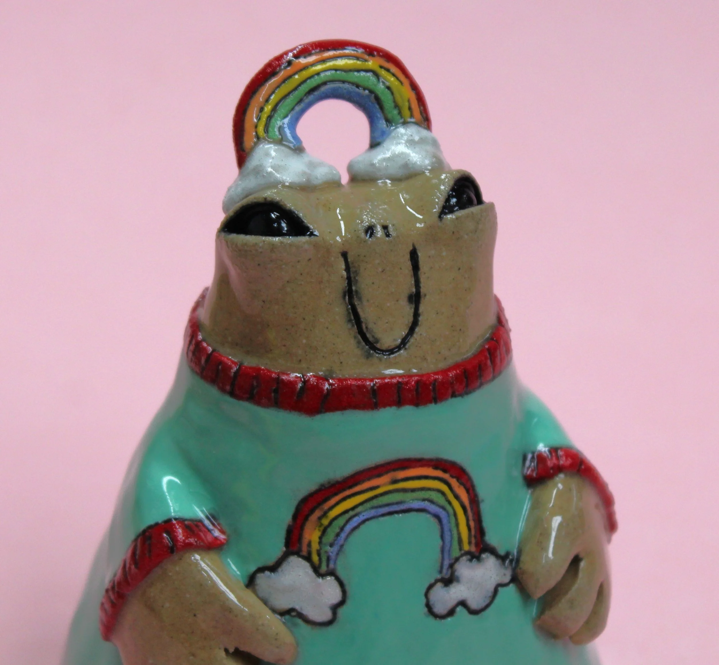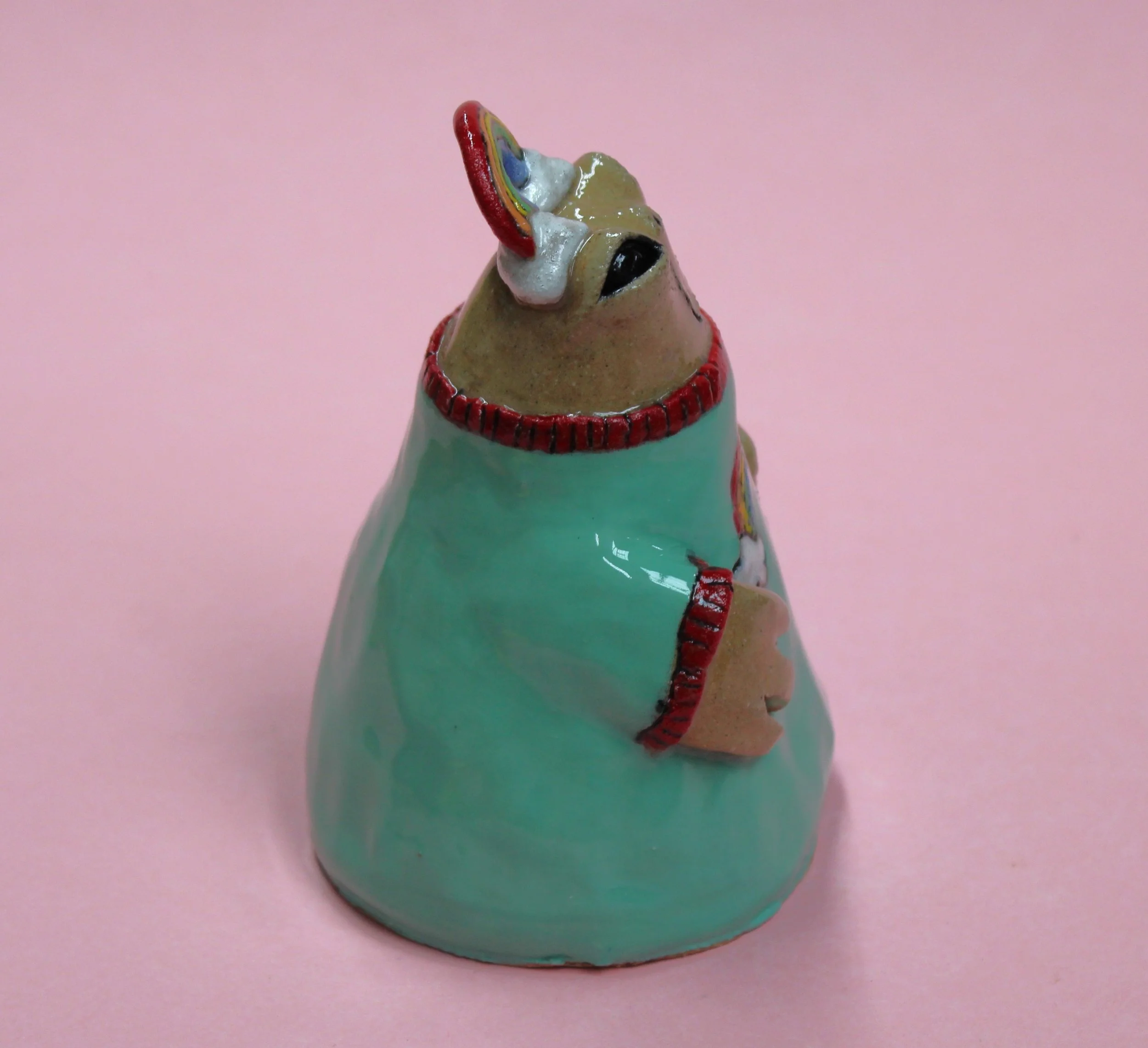 Handbuilt by me in a ceramics studio in Glasgow. This creature was made using buff stoneware clay and decorated with underglaze.