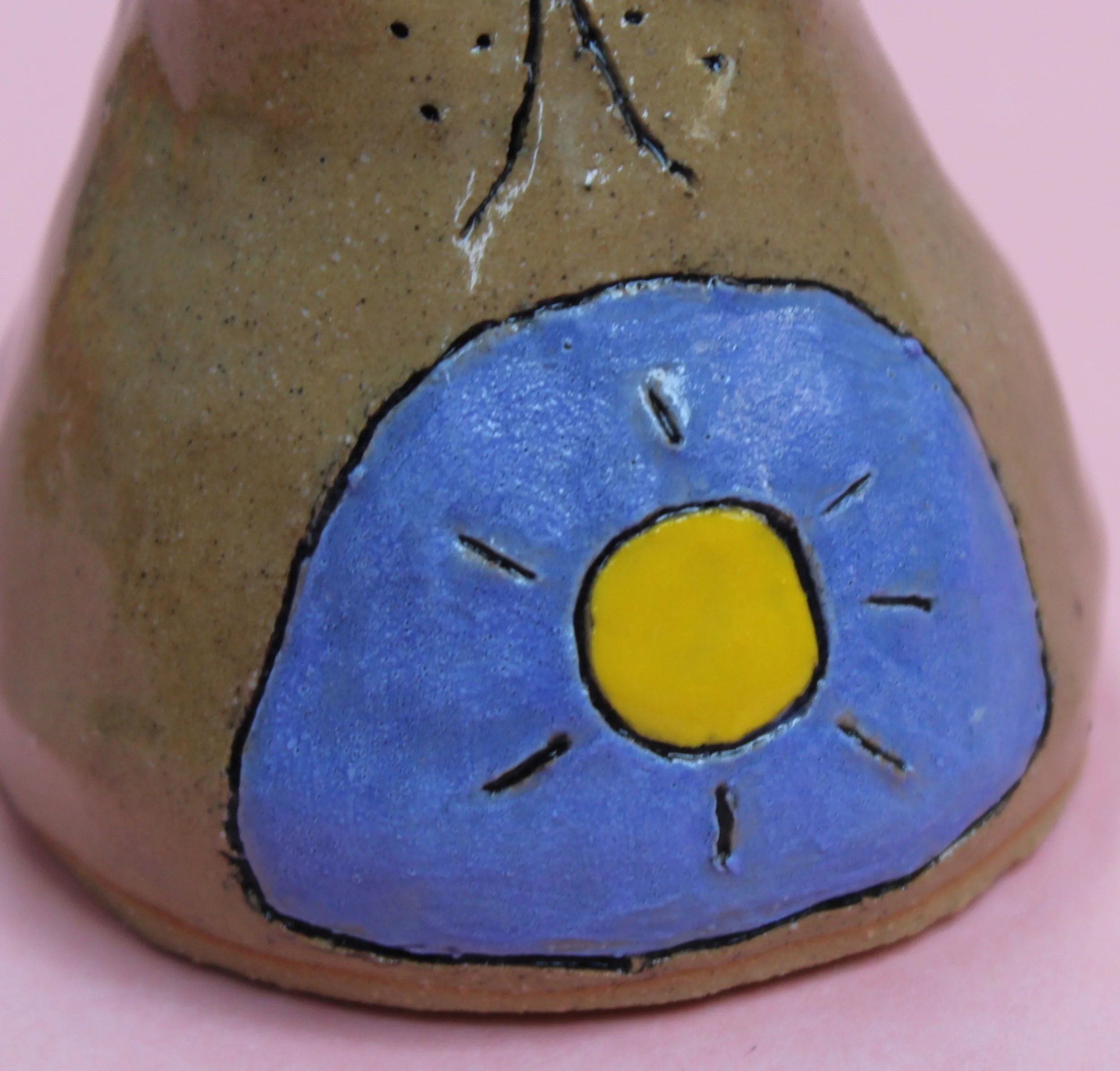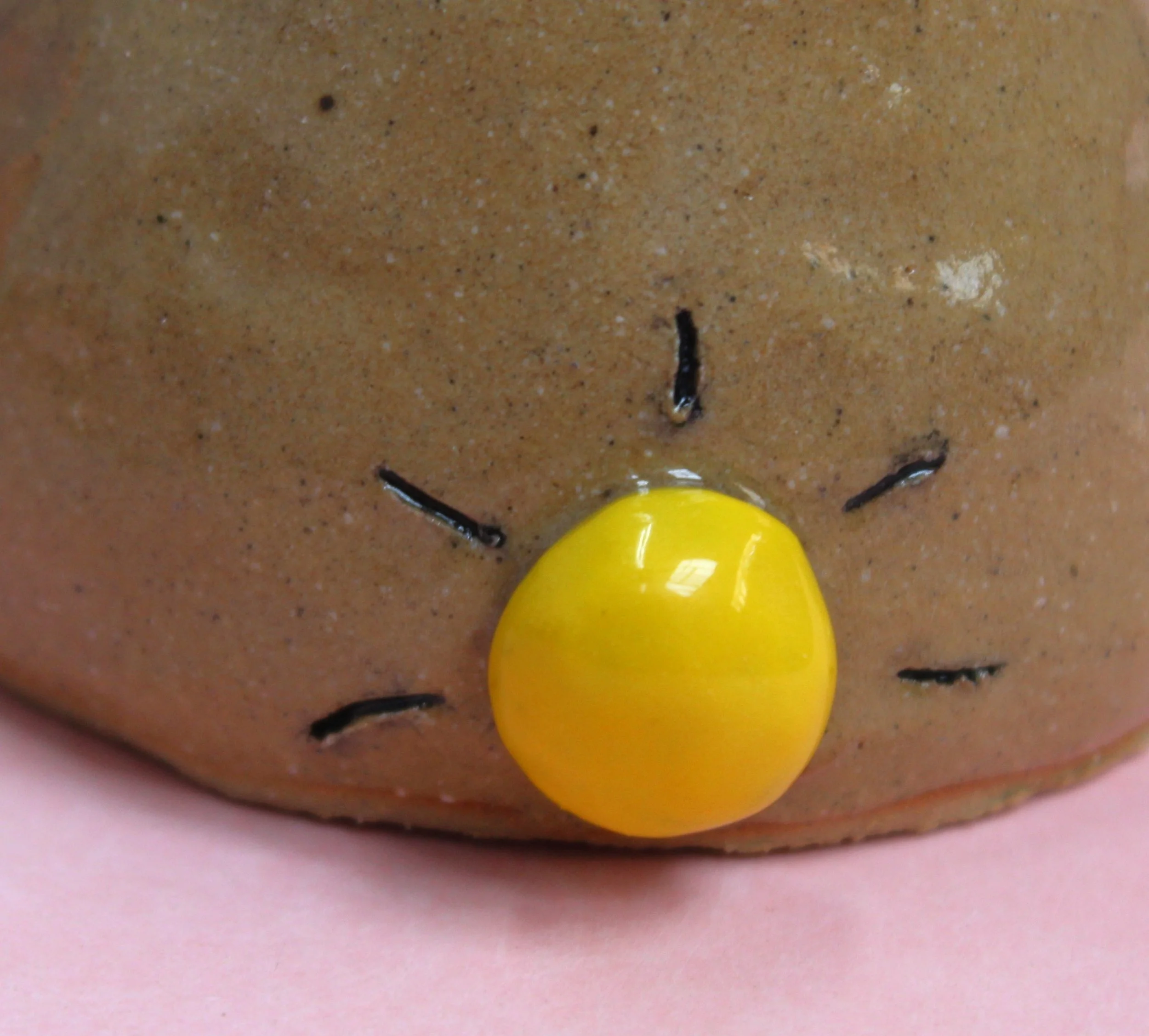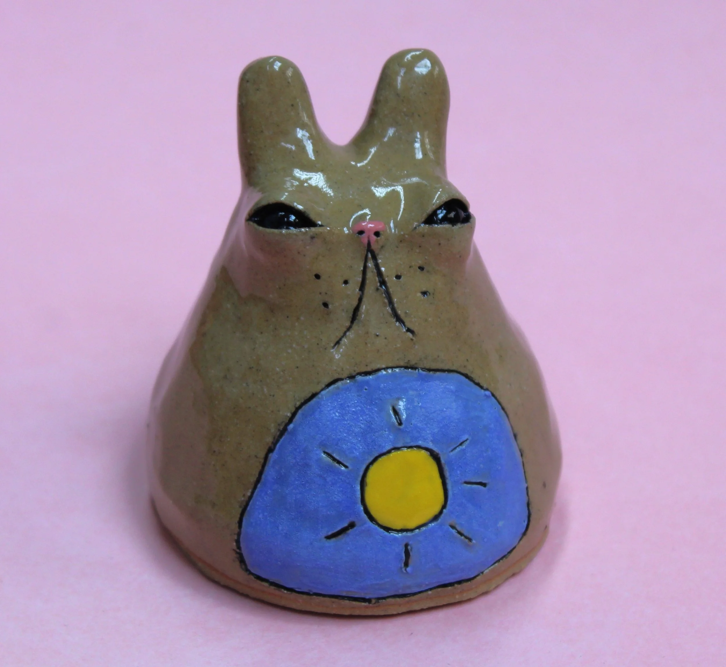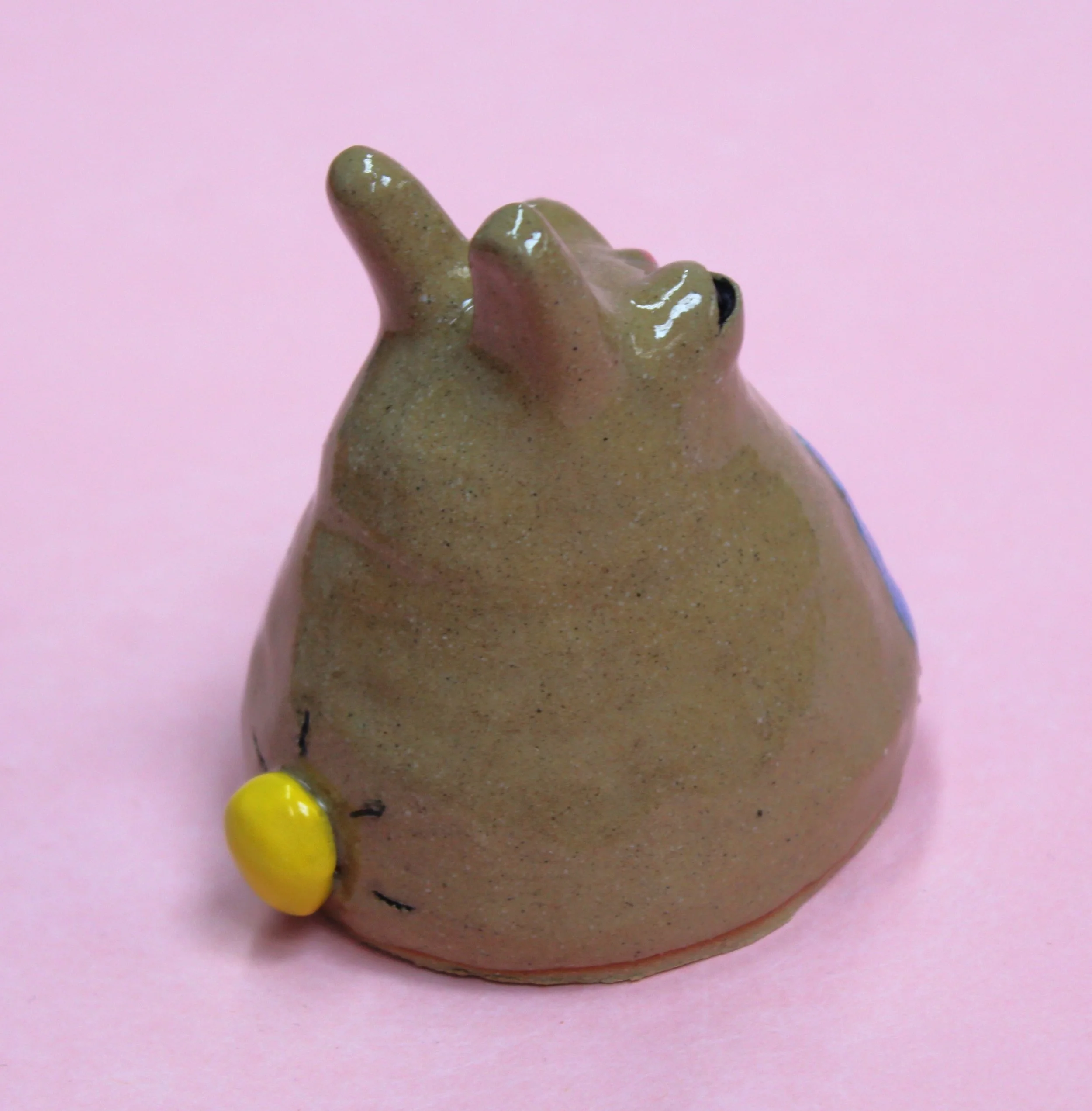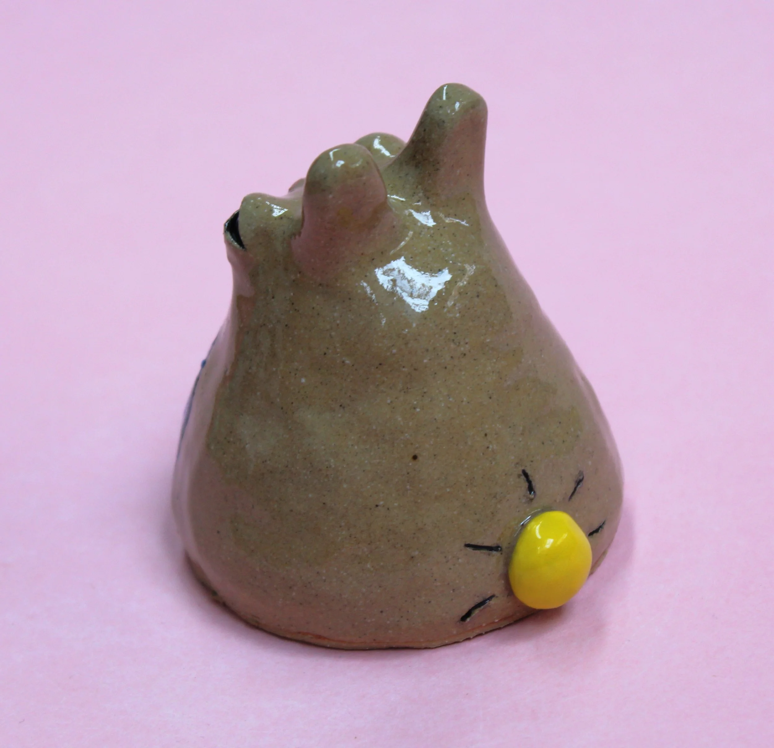 Handbuilt by me in a ceramics studio in Glasgow. This creature was made using buff stoneware clay and decorated with underglaze.